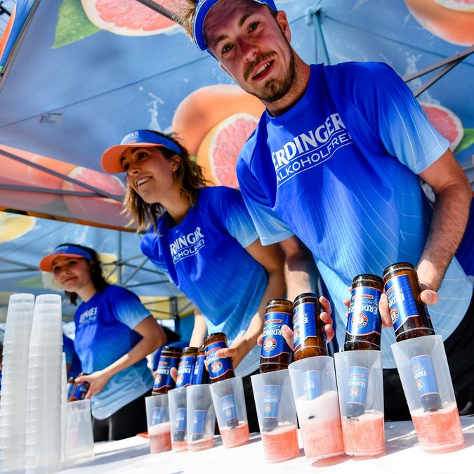 Beim 3. AOK Firmenlauf Pforzheim werden neben dem ERDINGER alkoholfrei auch die alkoholfreien Sorten Zitrone und Grapefruit angeboten